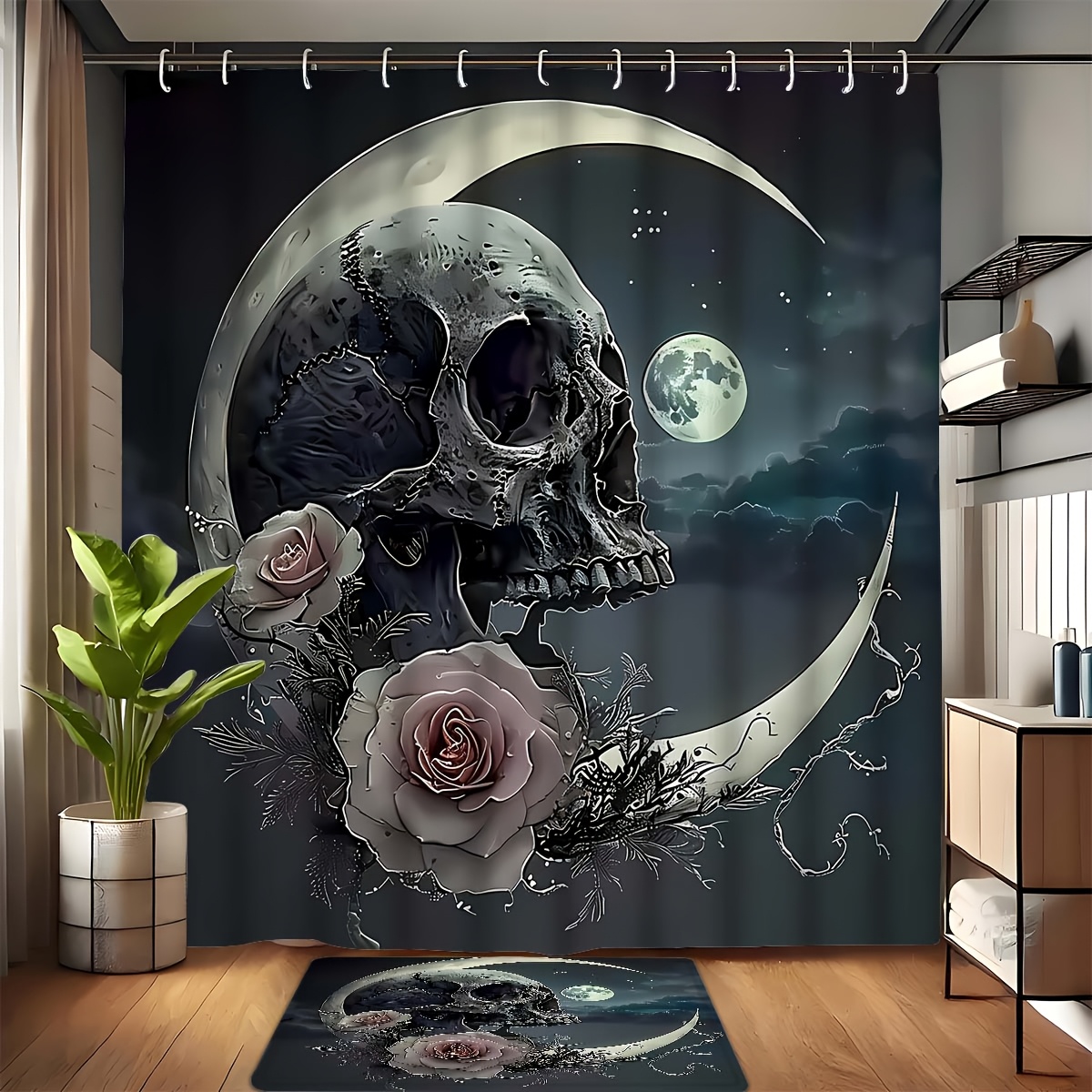1/4pcs Creative Skull and Moon Bathroom Set, Full Set, Non-Slip Bath Mat, U-shaped Carpet, Toilet Mat, High Quality Shower Curtain with 12 Durable Hooks, Exquisite Bathroom Decorations and Accessories, Suitable for All Styles