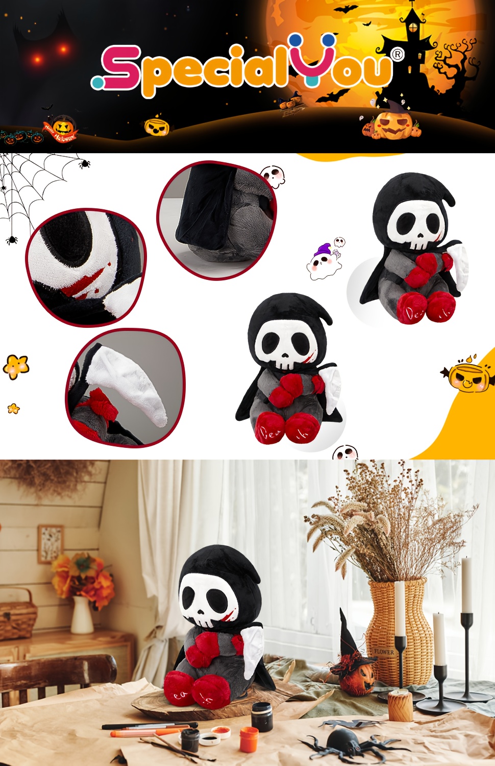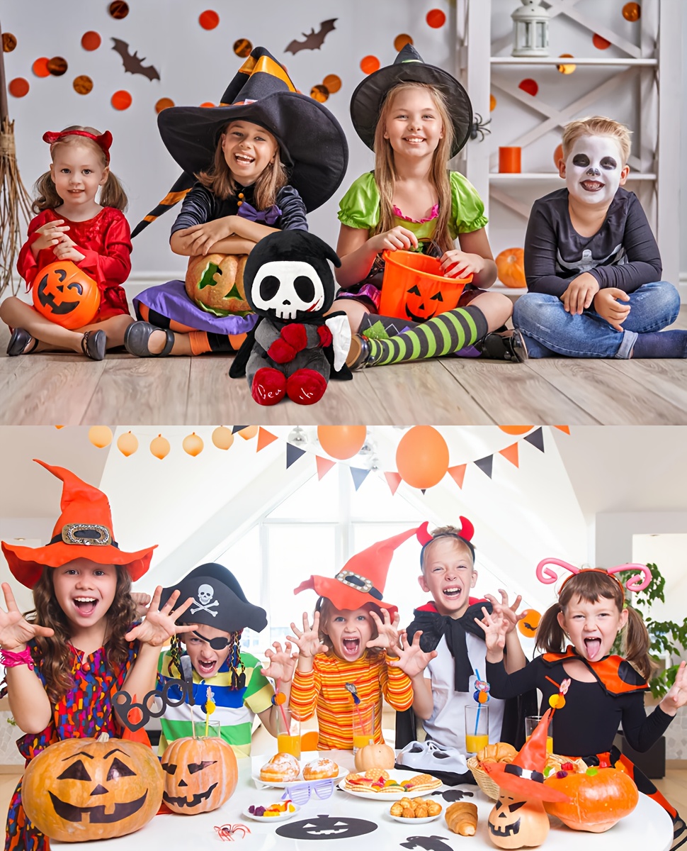 10" Otto Reaper Plush Toy, Halloween Skull Grim Reaper Stuffed Animal with Black Cape And Detachable Reaper Scythe, Funny Doll Skull Death Plushies Holiday Plush Toy Doll, Halloween Decor, Spooky Decor, Holiday Decoration, Go