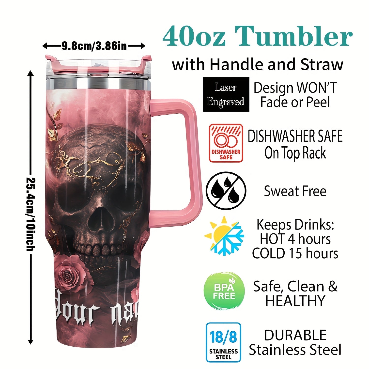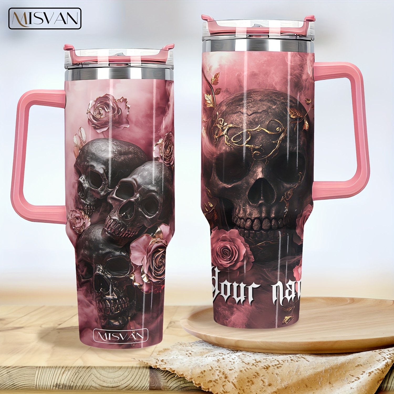 1pc MISVAN Personalized Tumbler with Lid - Custom Name Pink Golden Rose Skull Print 40oz Stainless Steel Insulated Water Bottle, BPA-Free Hot & Cold Drinkware for Outdoor Travel, Mother's Day Father's Day Graduation Gifts