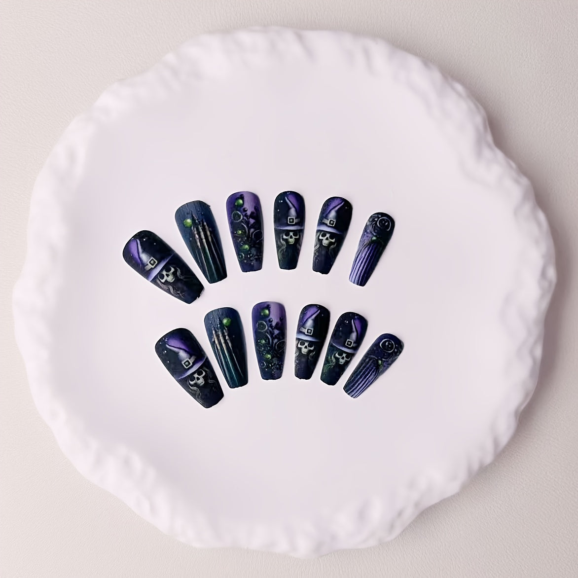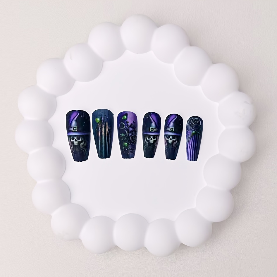 [24pcs Halloween Nail Art Set] 24pcs Halloween Nail Art Set - Spooky Witch Hat, Broomstick & Skull Design with Green Bubble Accents, Removable Ballet Nails for Festive Manicure