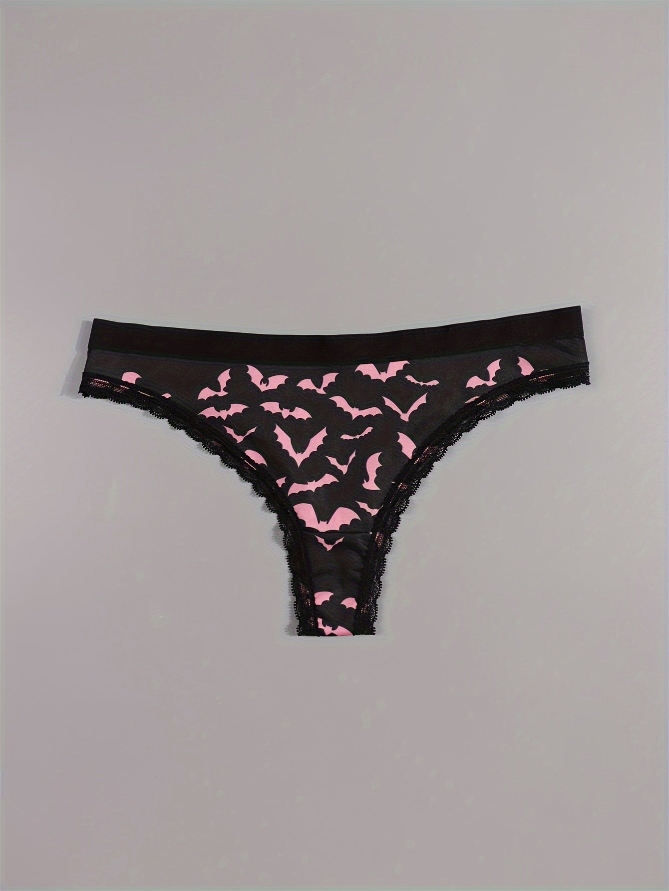 4pcs Gothic Lace Thong Panties - Black Skull & Eyeball Design with Mushrooms & Bats, Comfortable Silky Intimates for Women, Halloween-Themed Lingerie, MORVIA Brand, Halloween Lingerie | Skull Print Design | Silky Texture, Hal