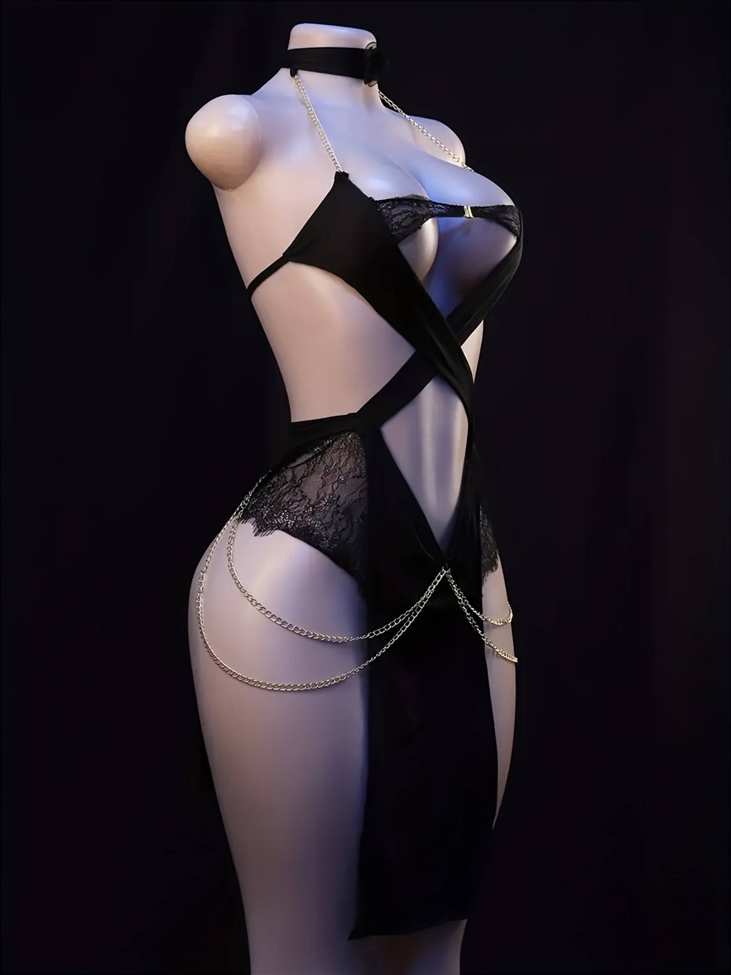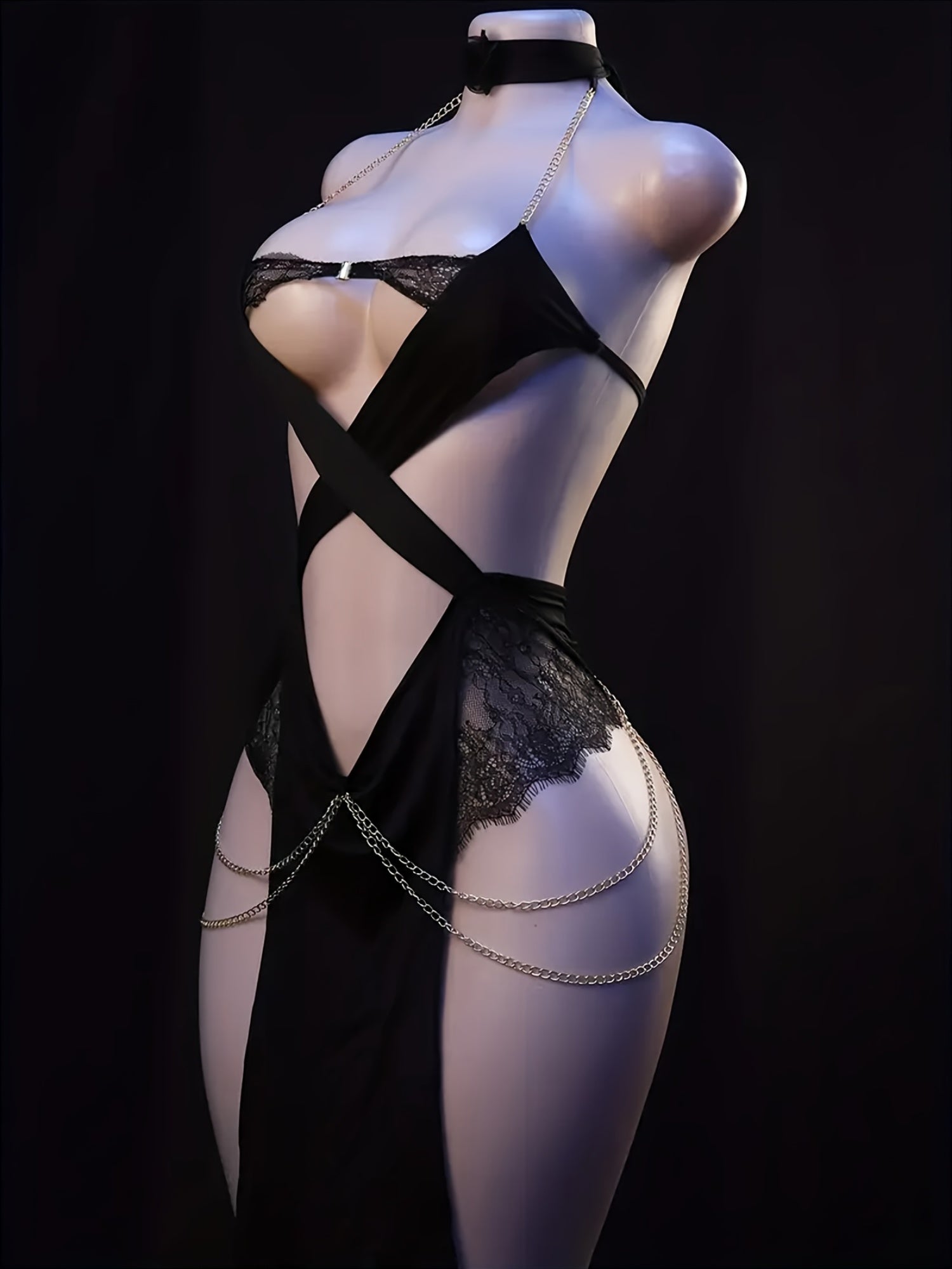Egyptian Catwoman Costume Dress - Sexy Gothic Outfit with Golden Chain Accents, Black Role-Playing Suit for Halloween, Cosplay, Themed Parties - Adult Costume Party Attire, Halloween Costume, Themed Event Attire, Elegant Desi