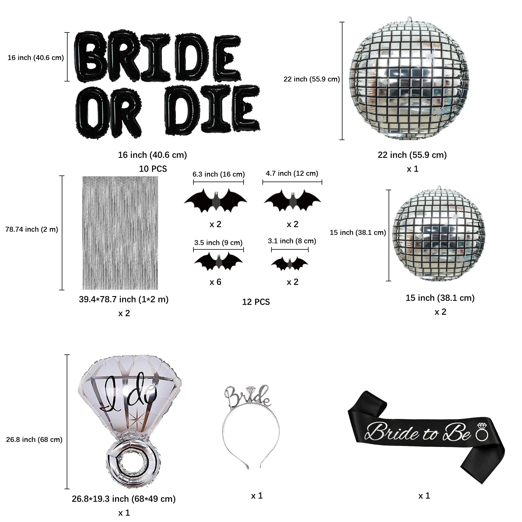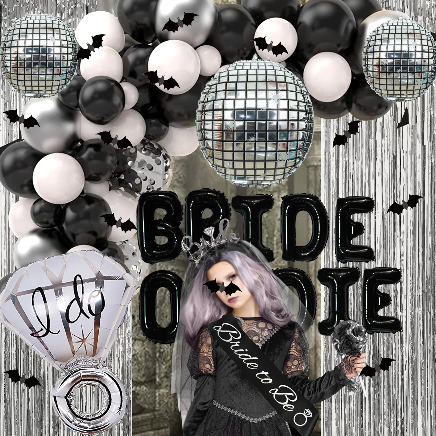 Goth Black White BRIDE OR DIE Bachelorette Bridal Shower Party Decorations, Diamond Ring Disco Balloons Garland Foil Curtains