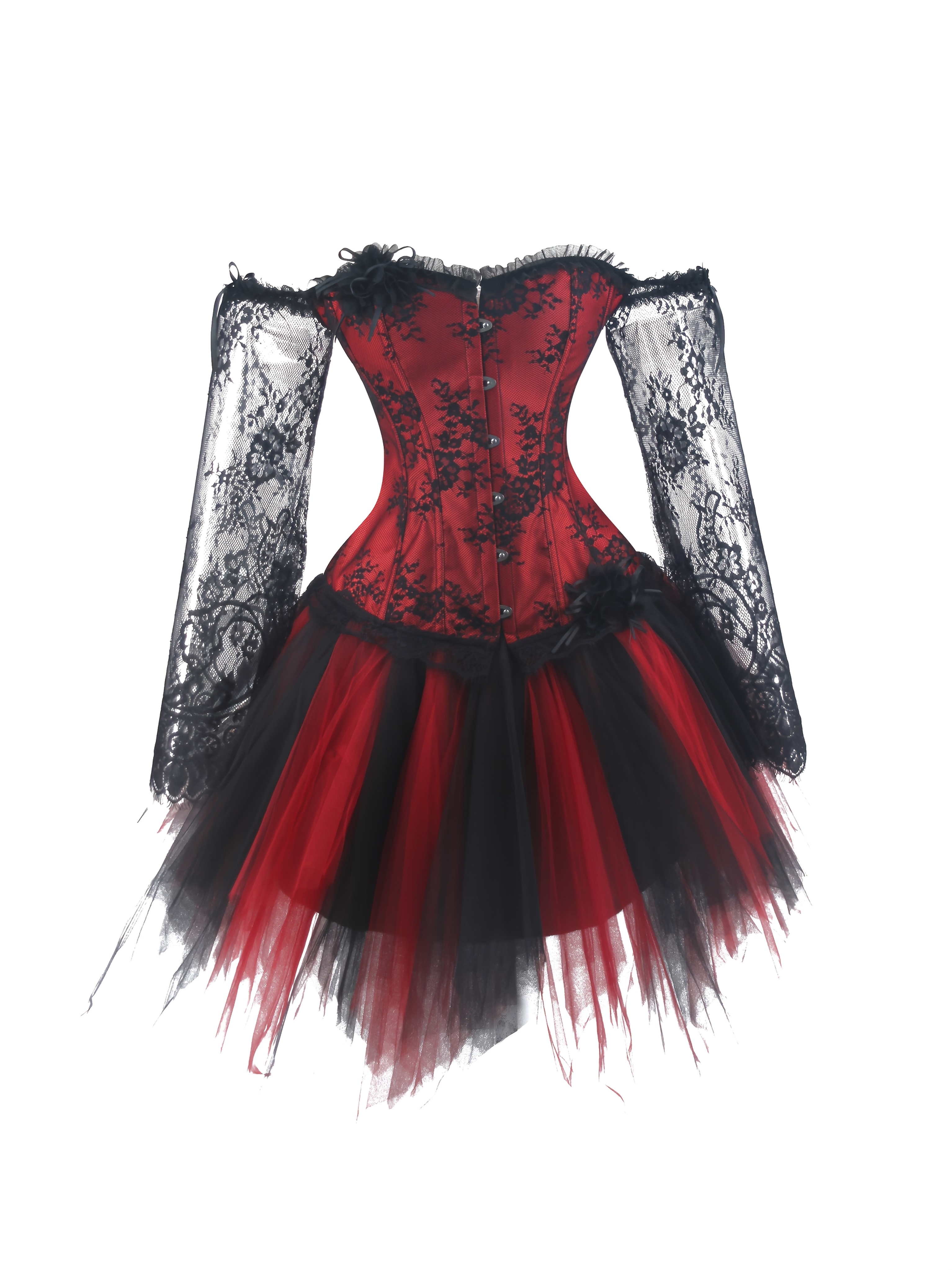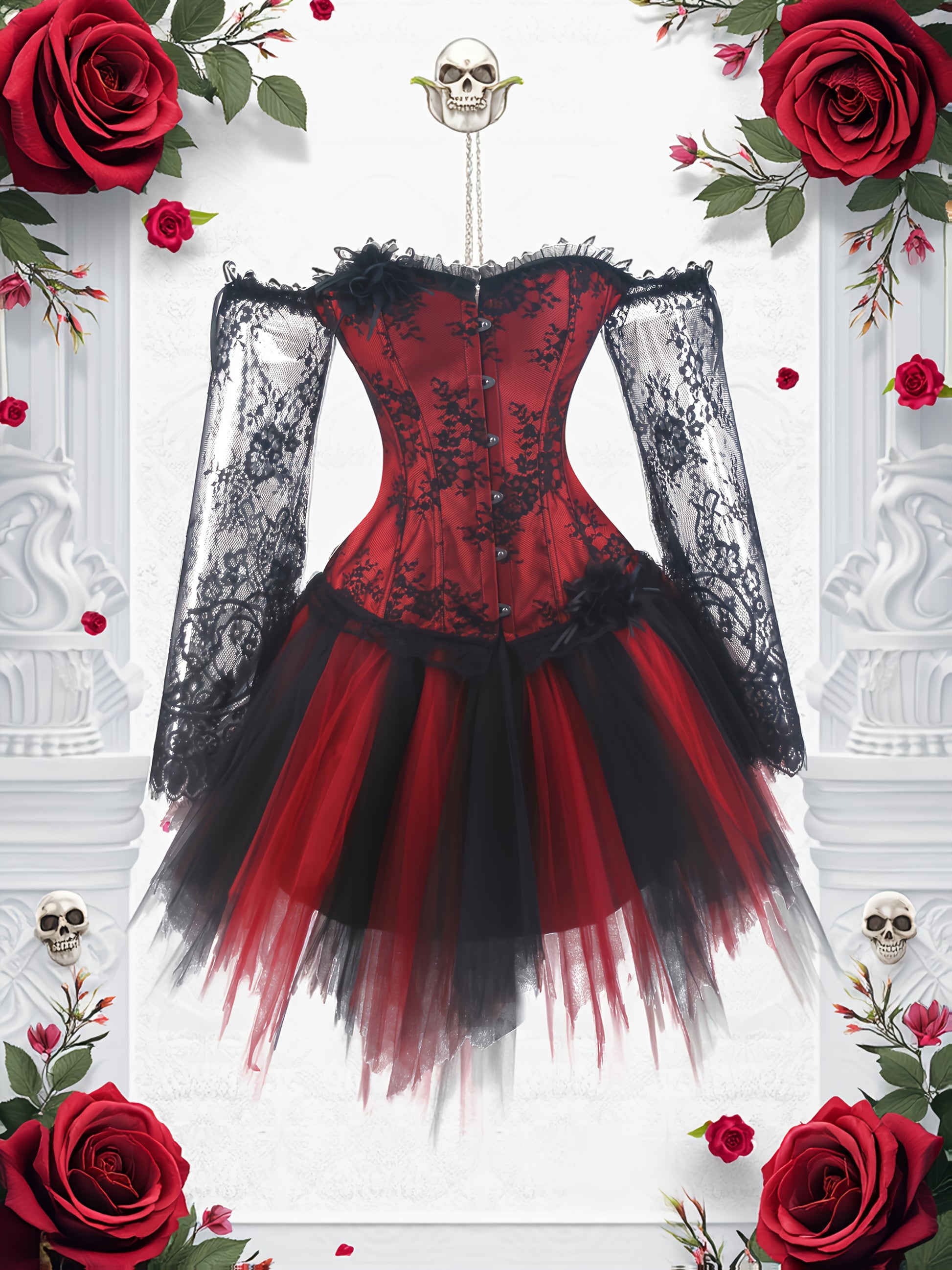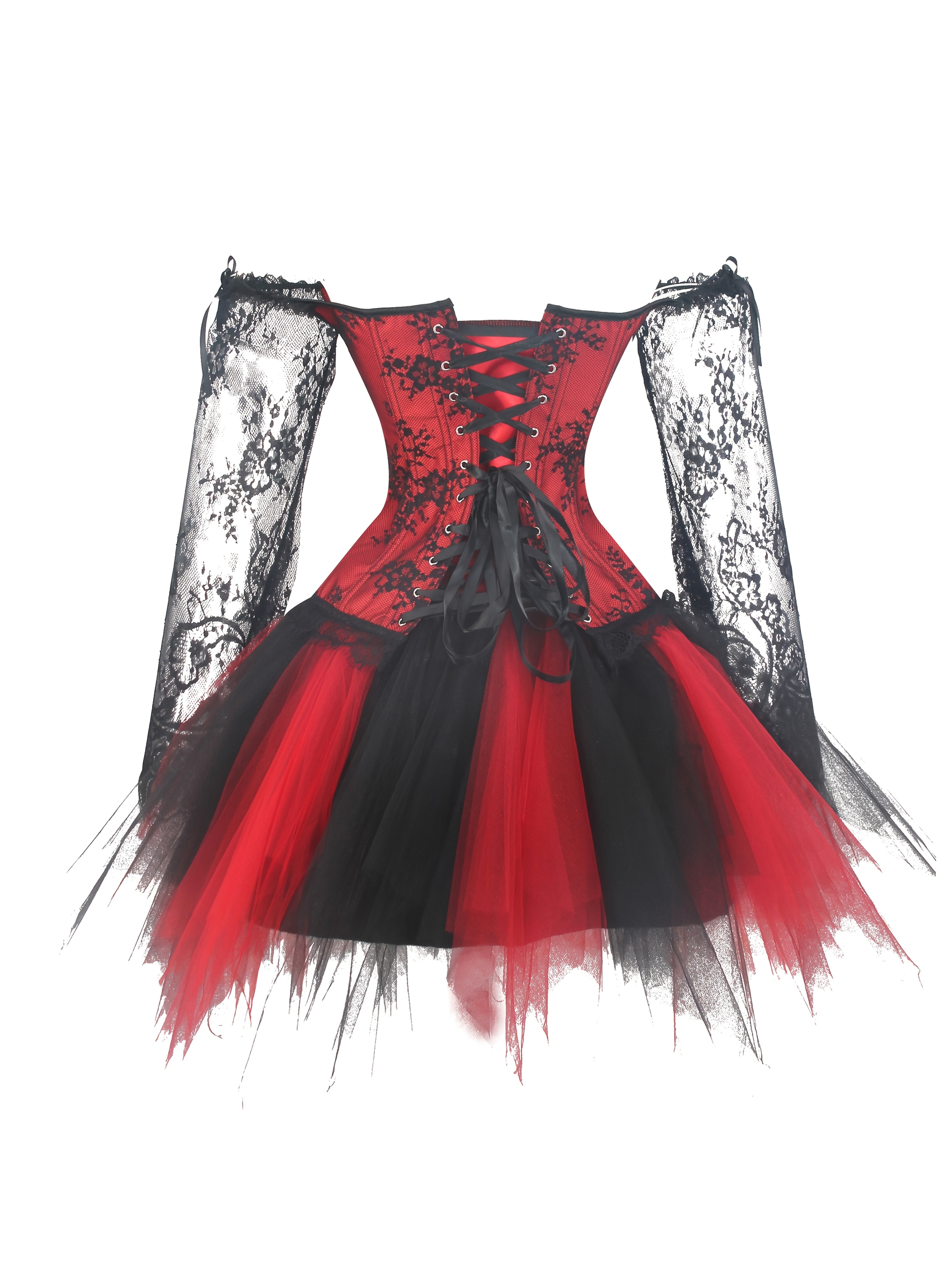 [Halloween Costume Set] Halloween Vampire Witch Costume Set, Dark Gothic Victorian Style Lace Long Sleeve Corset + Black Lolita Style TUTU Skirt, Day of the Dead Party Outfit