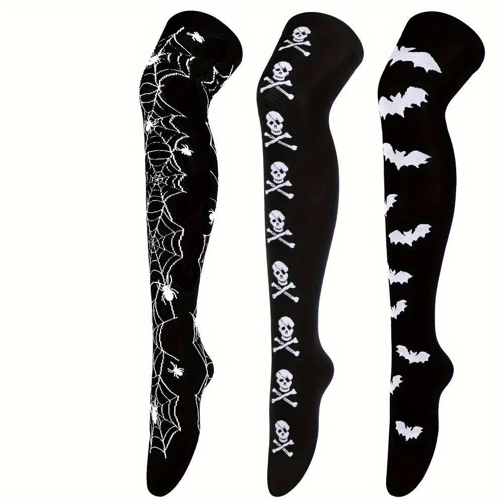 [Halloween-themed Women's socks] 3 pairs of Halloween-themed skull and bat full-body print funny Women's over-the-knee socks, soft, comfortable, tight and high-stretch socks, suitable for parties and daily wear