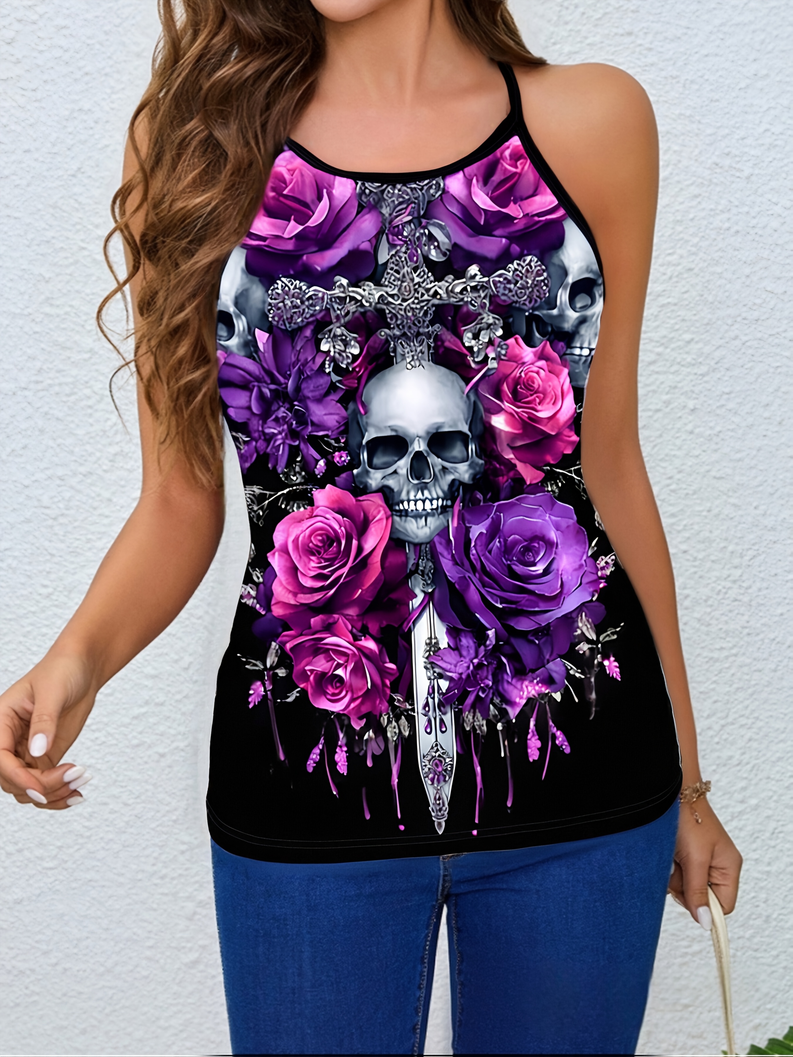 [Halloween] Women's Gothic Crossed Skull & Roses Backless T-Shirt - Edgy Halloween Party Top with Crisscross Strap, Non-See-Through Fabric for Costume Events, Everyday Gothic Outfits - Year-Round Dark Aesthetic Tee, Goth T Sh