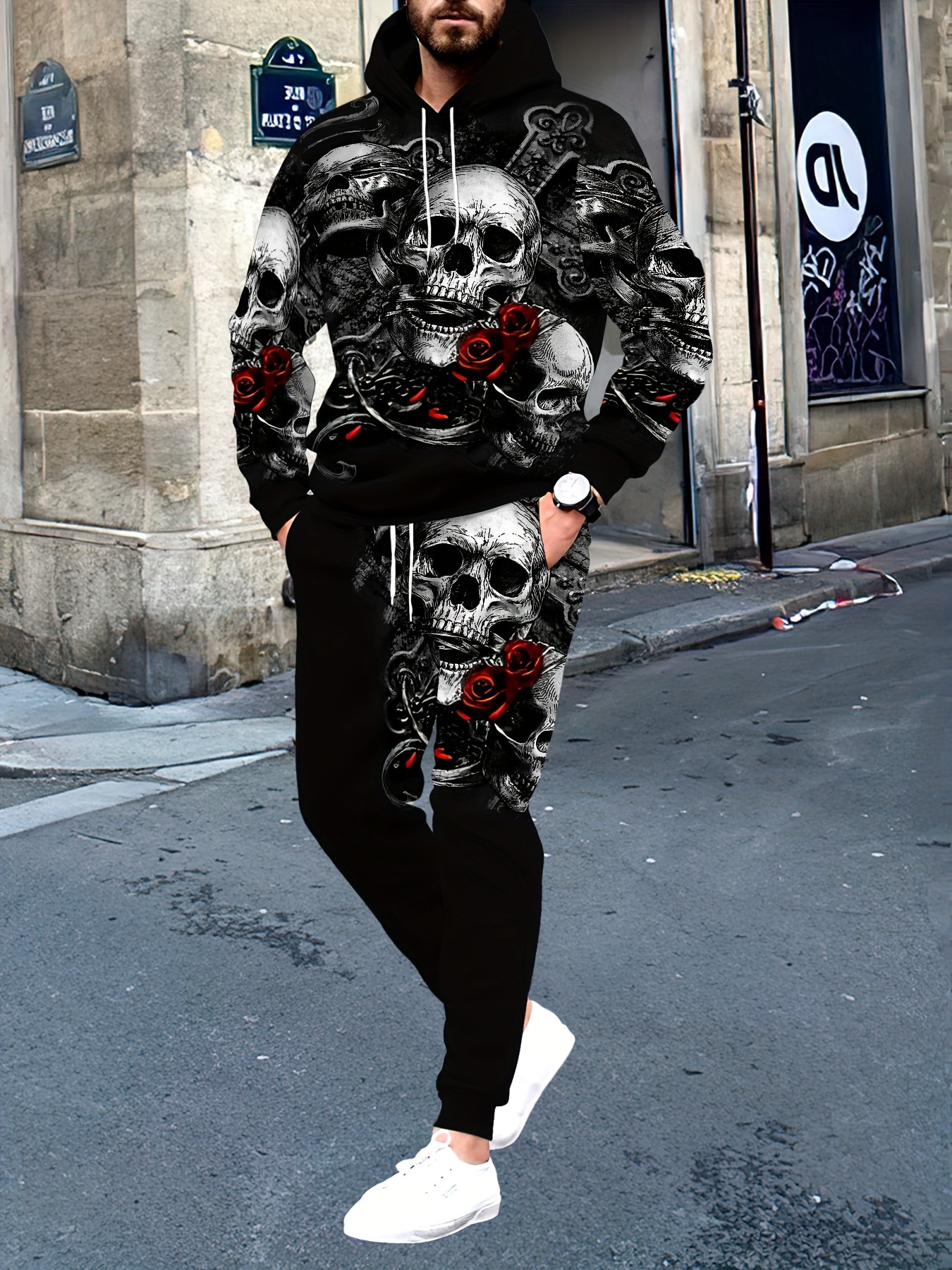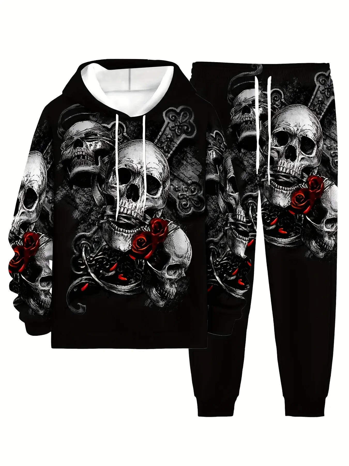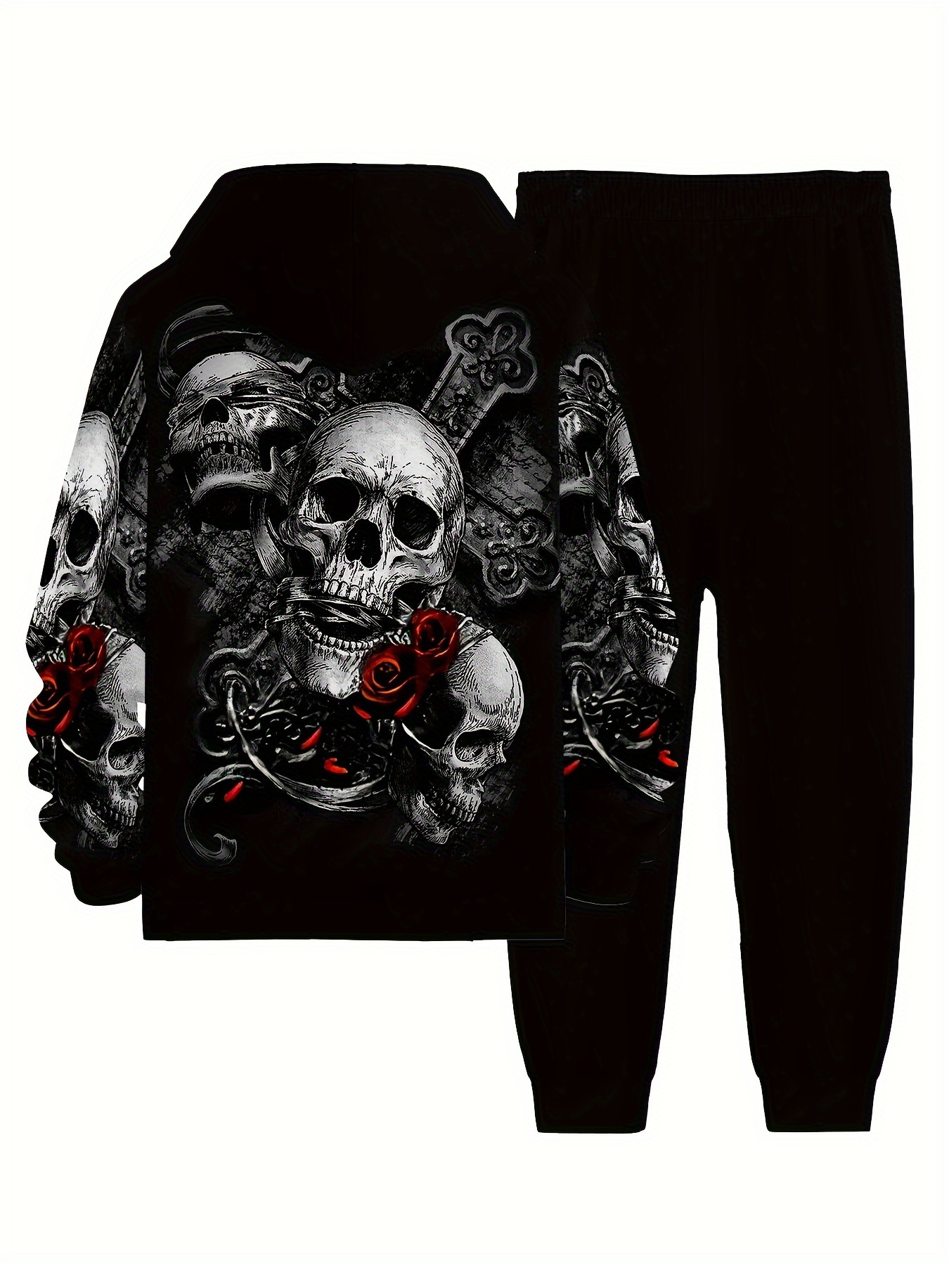 Men'S Gothic 3D Skull & Rose Print Hooded Sweatsuit - Full-Zip & Matching Joggers Set, Stretch Polyester Tracksuit with Pockets, Regular Fit Casual Outdoor Hiking & Casual Attire, Spring/Fall Themed Outfit (Skull & Rose Desig