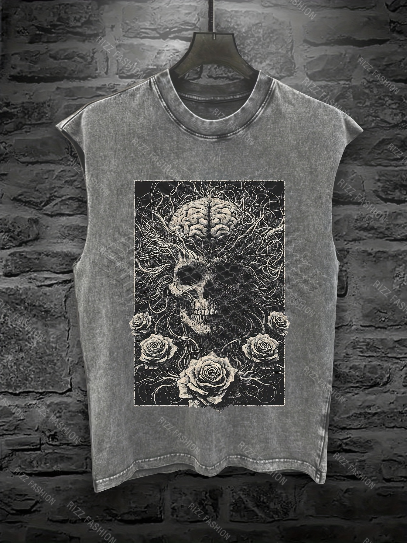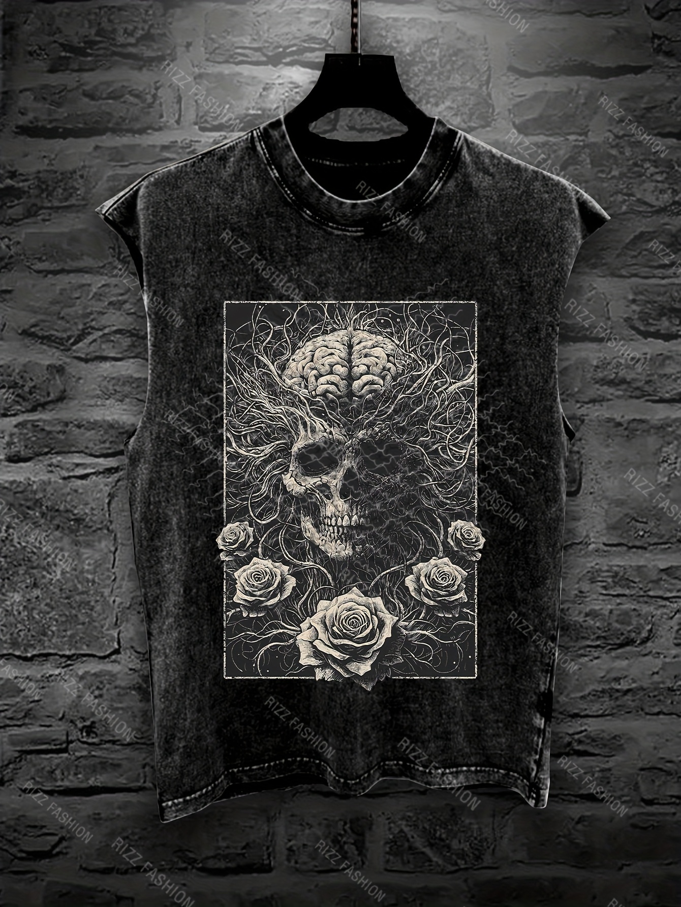 Men'S Gothic Sleeveless Vest - Dark Skeleton & Rose Print Streetwear Punk Style Loose Fit Washed Top | Edgy Skull & Rose Design with Intricate Bone & Bat Wing Patterns | Summer Outdoor Casual Wear, Concerts, Gothic Outfits |