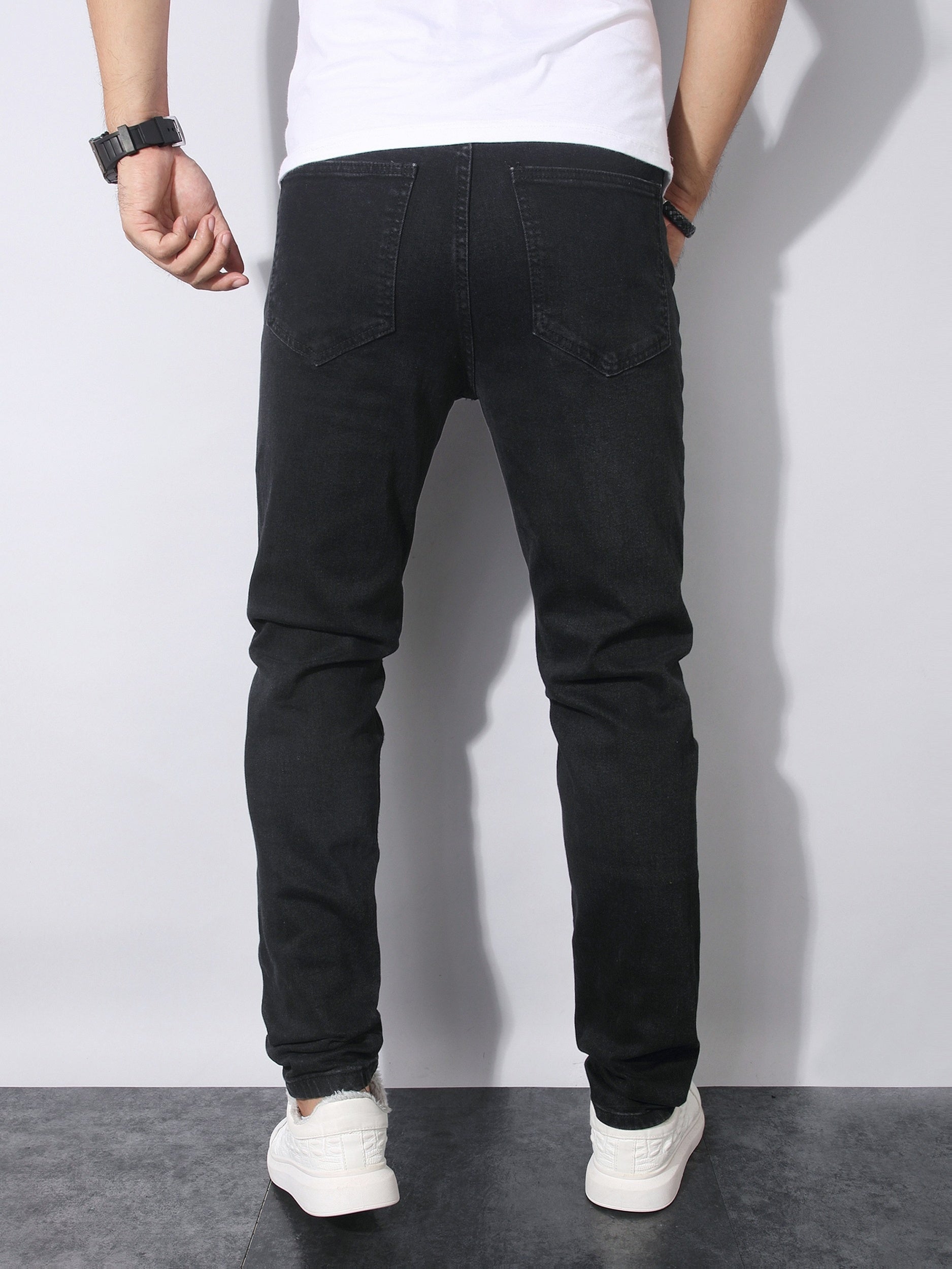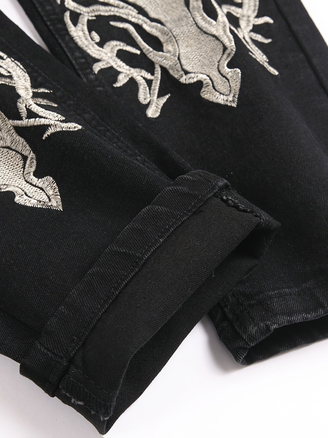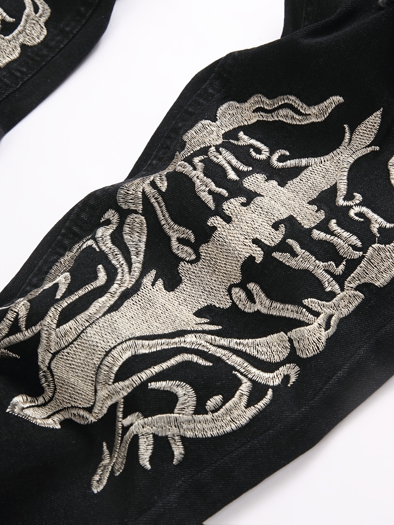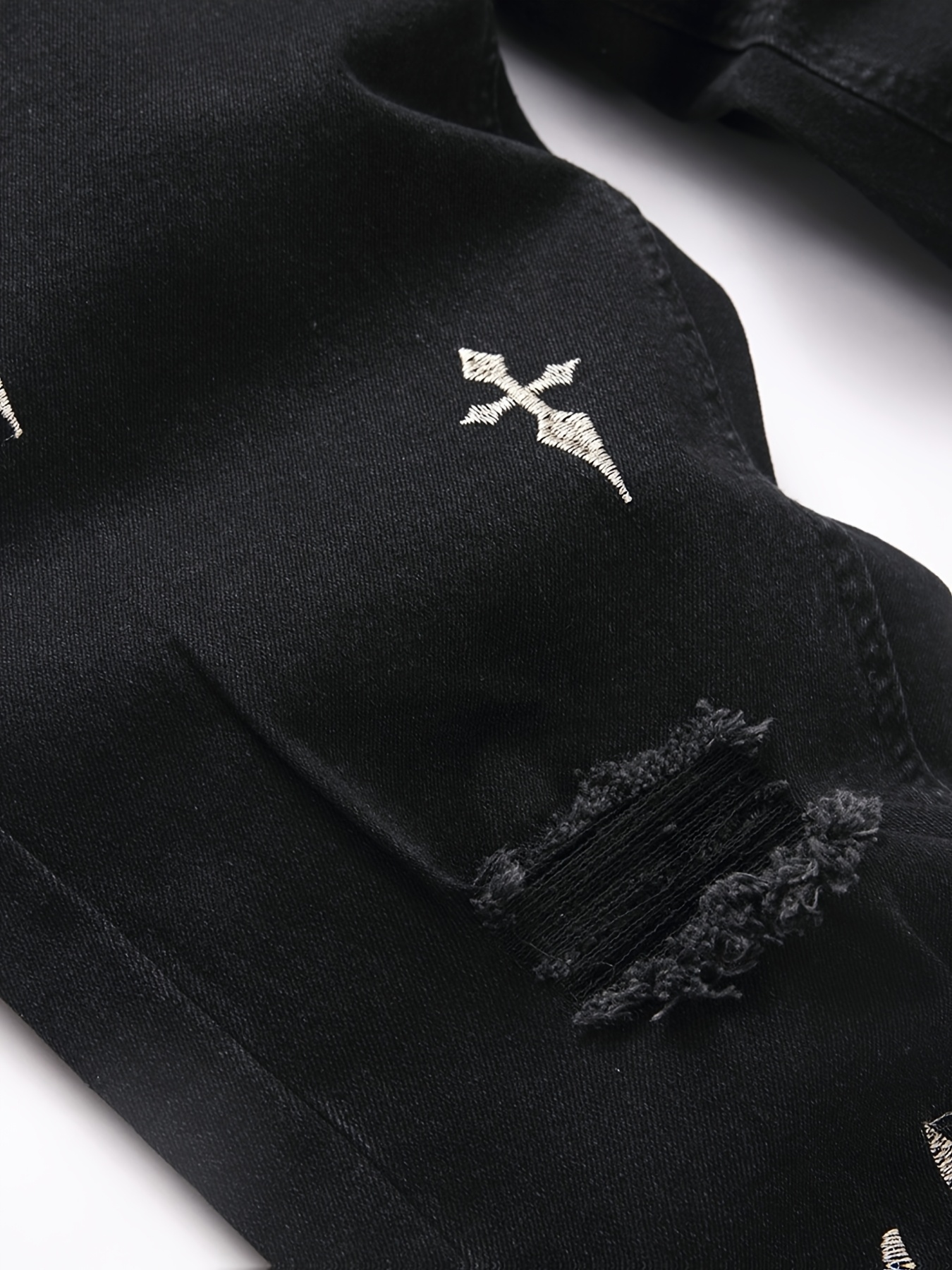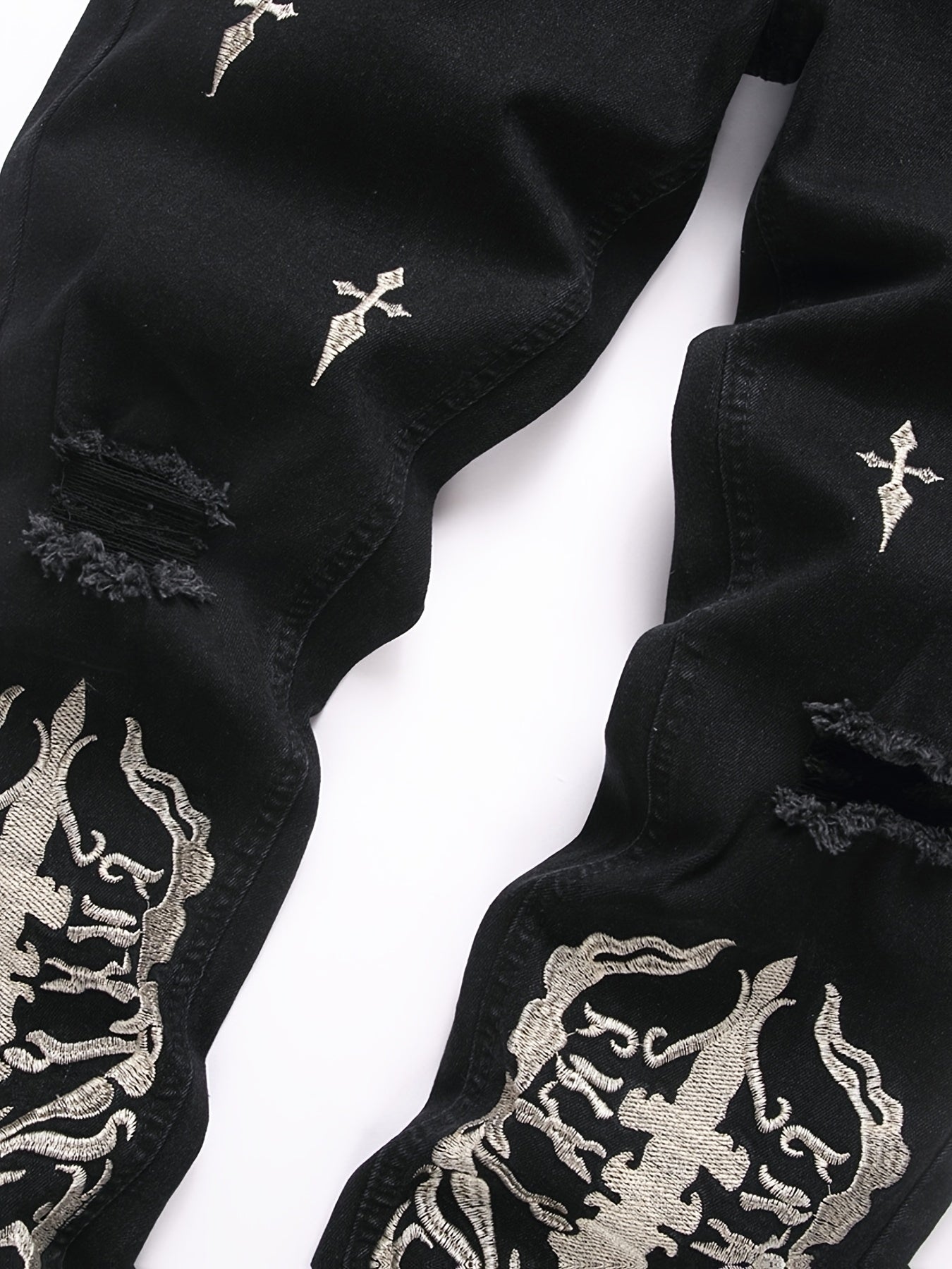 Men's Gothic Streetwear Distressed Black Slim-Fit Trousers with White Skull & Cross Print - All-Season Stretch Jeans for Casual & Statement Outfits, Gothic Pants For Men, Horror Pants For Men, Hip Hop Pants For Men, Printed T