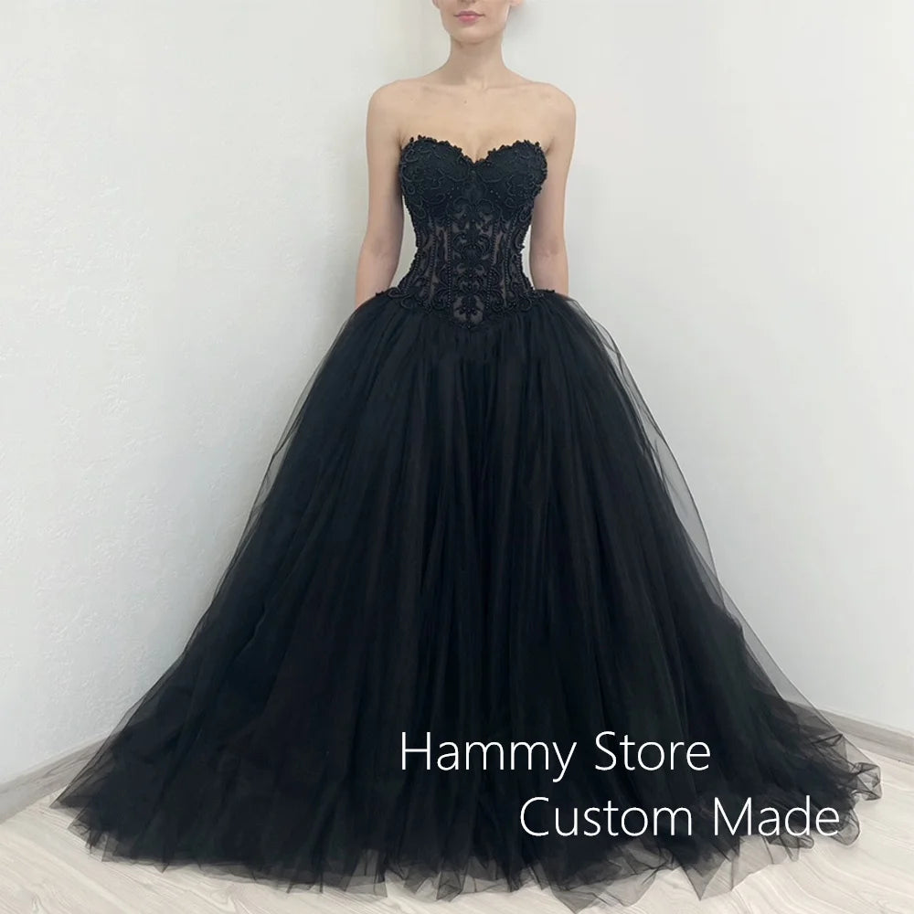 Pearls Gothic Wedding Dress Customized Sweetheart Applique Ball Gown Corset Bride Dresses Robe Mariee Black Wedding Gowns