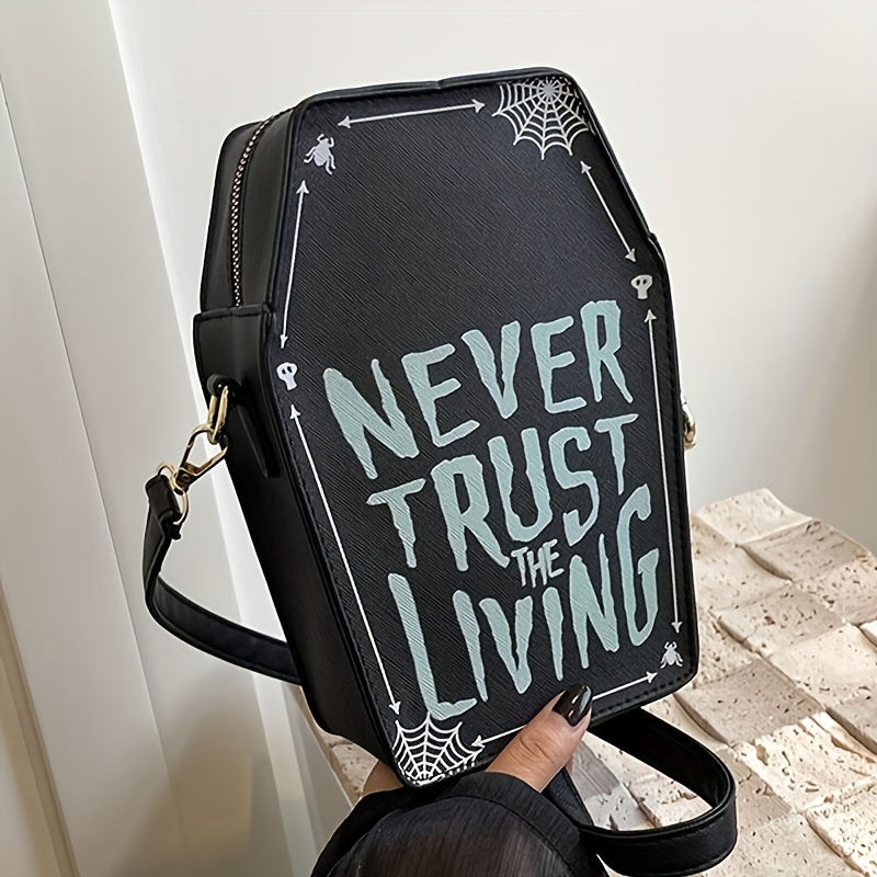 Perfect Halloween Coffin Bag • "Never Trust the Living" Design • Adjustable Strap • Zipper Closure • Polyester Lining • Dry Clean Only • Black Crossbody for Women • Halloween Costume Accessory • Trickory Desig