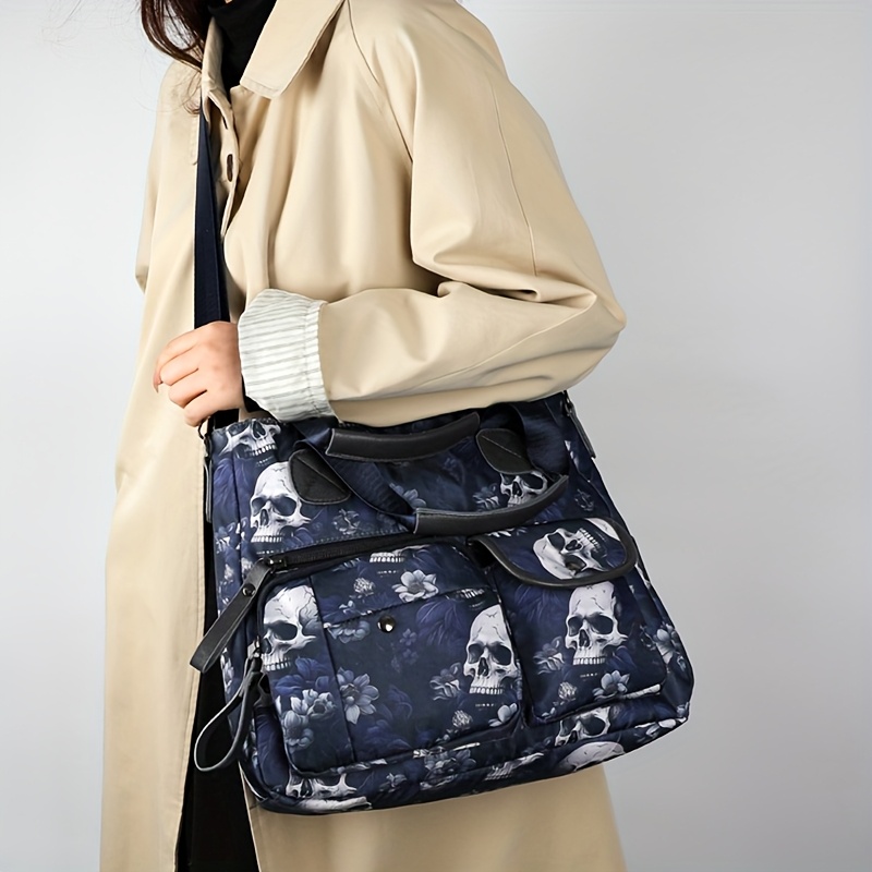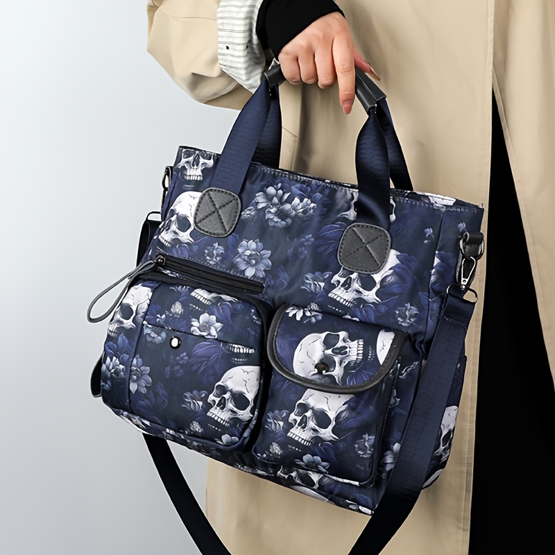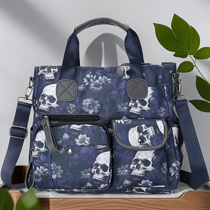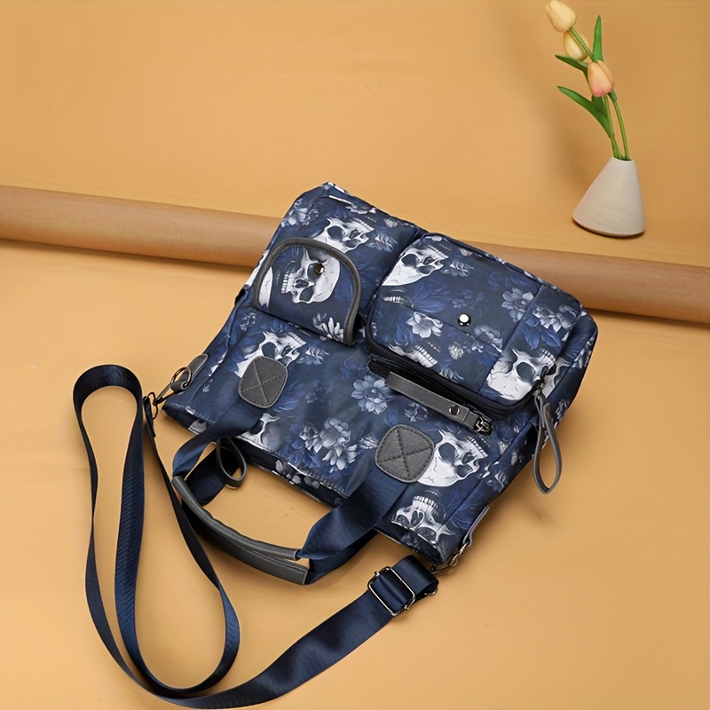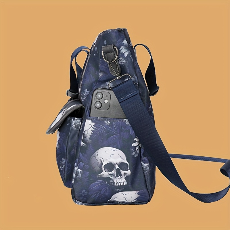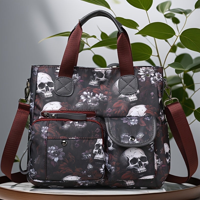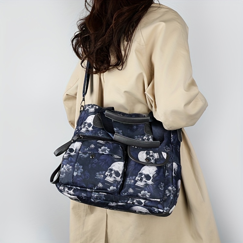 Perfect Lily Women's Punk Style Skull & Floral Print Crossbody Tote Bag - Red/Blue Nylon Multi-Pocket Handbag with Detachable Adjustable Shoulder Strap, Zipper Closure & Polyester Lining for Daily Commute, Work, Casual Outing