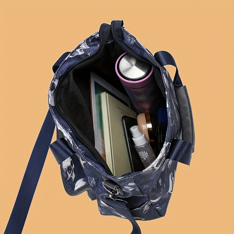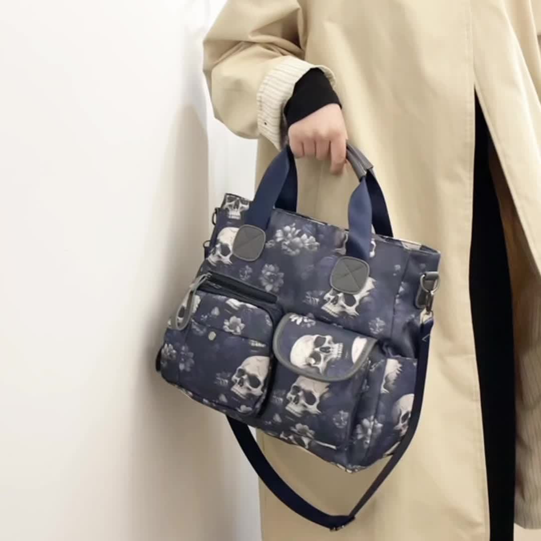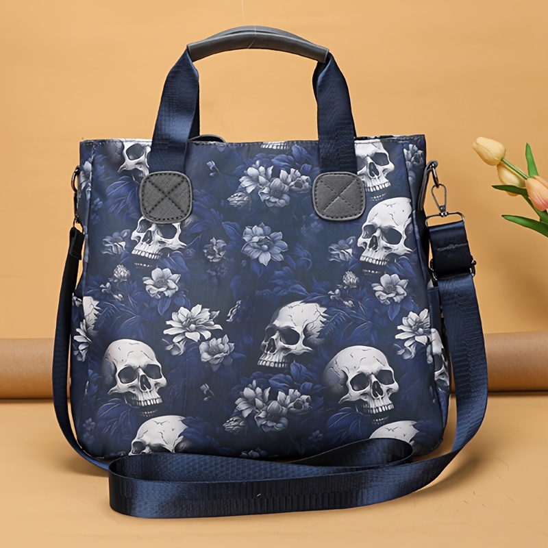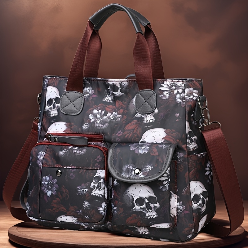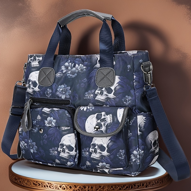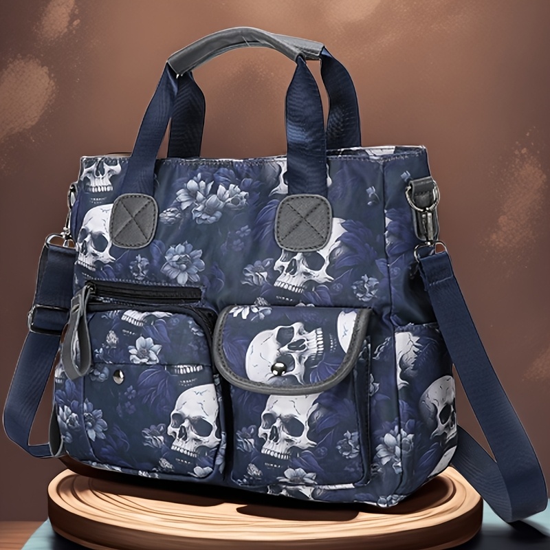 Perfect Lily Women's Punk Style Skull & Floral Print Crossbody Tote Bag - Red/Blue Nylon Multi-Pocket Handbag with Detachable Adjustable Shoulder Strap, Zipper Closure & Polyester Lining for Daily Commute, Work, Casual Outing