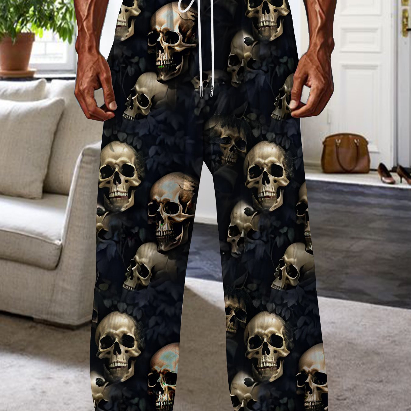 [Skull Print Joggers] Black Golden Skulls Men's Loose Fit Joggers | Comfortable Retro Style, Straight Leg, Drawstring Waist, Casual, Fall & Winter Comfort Wear