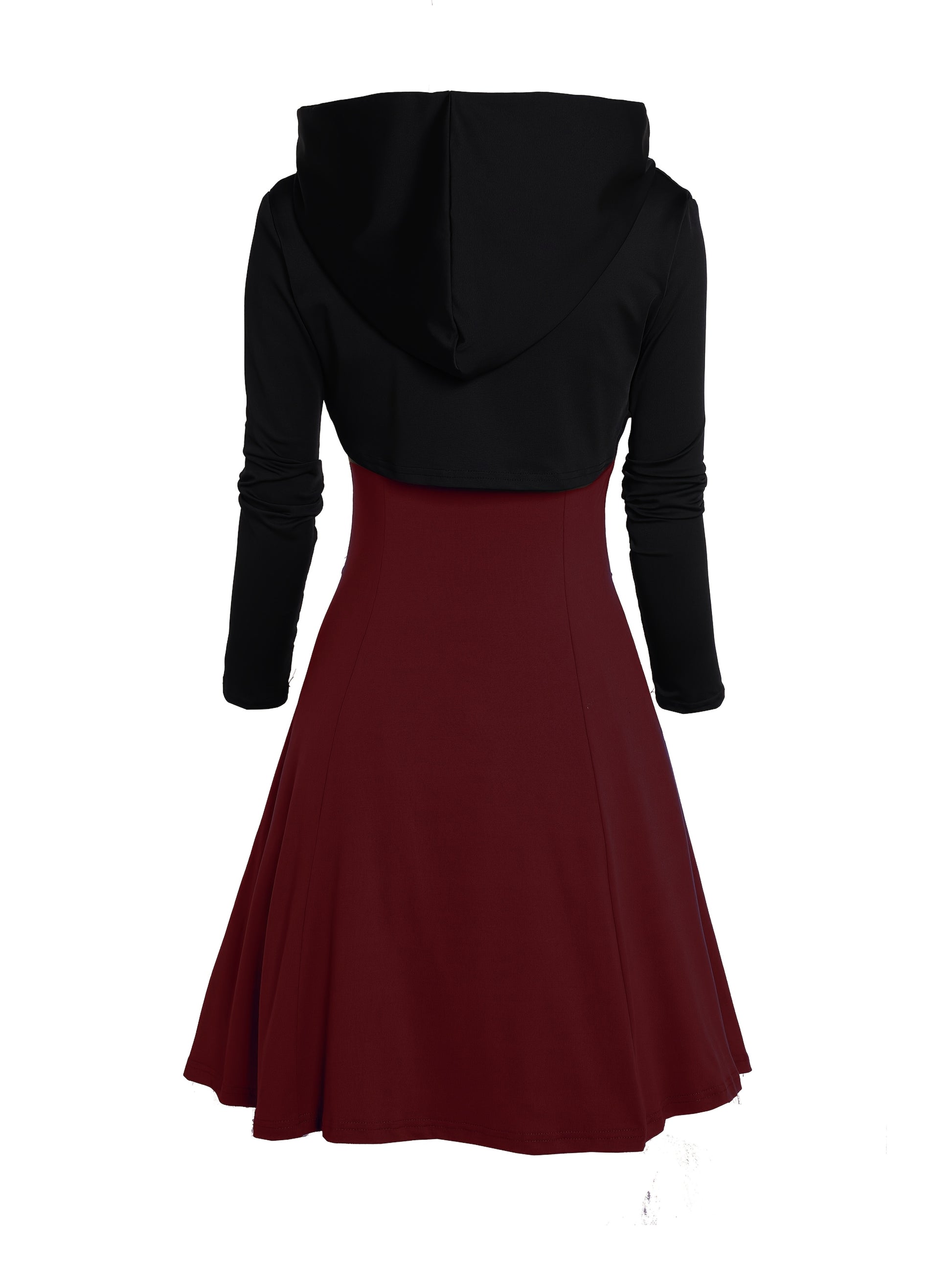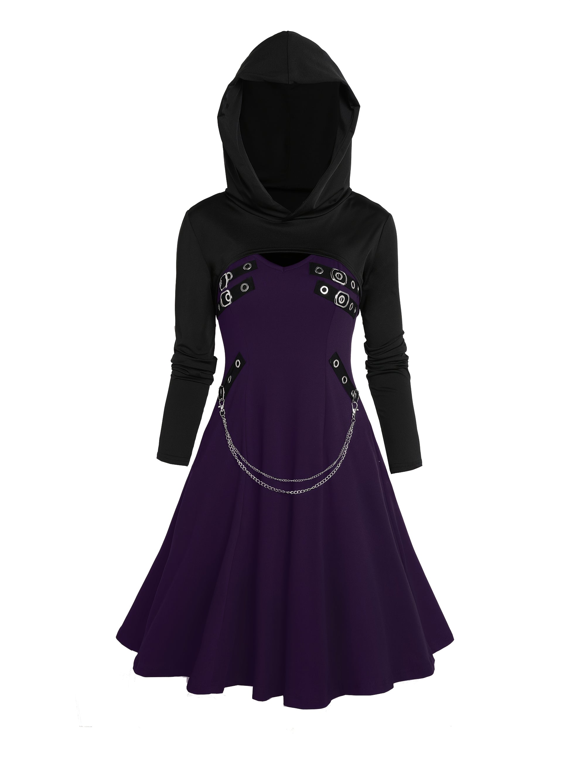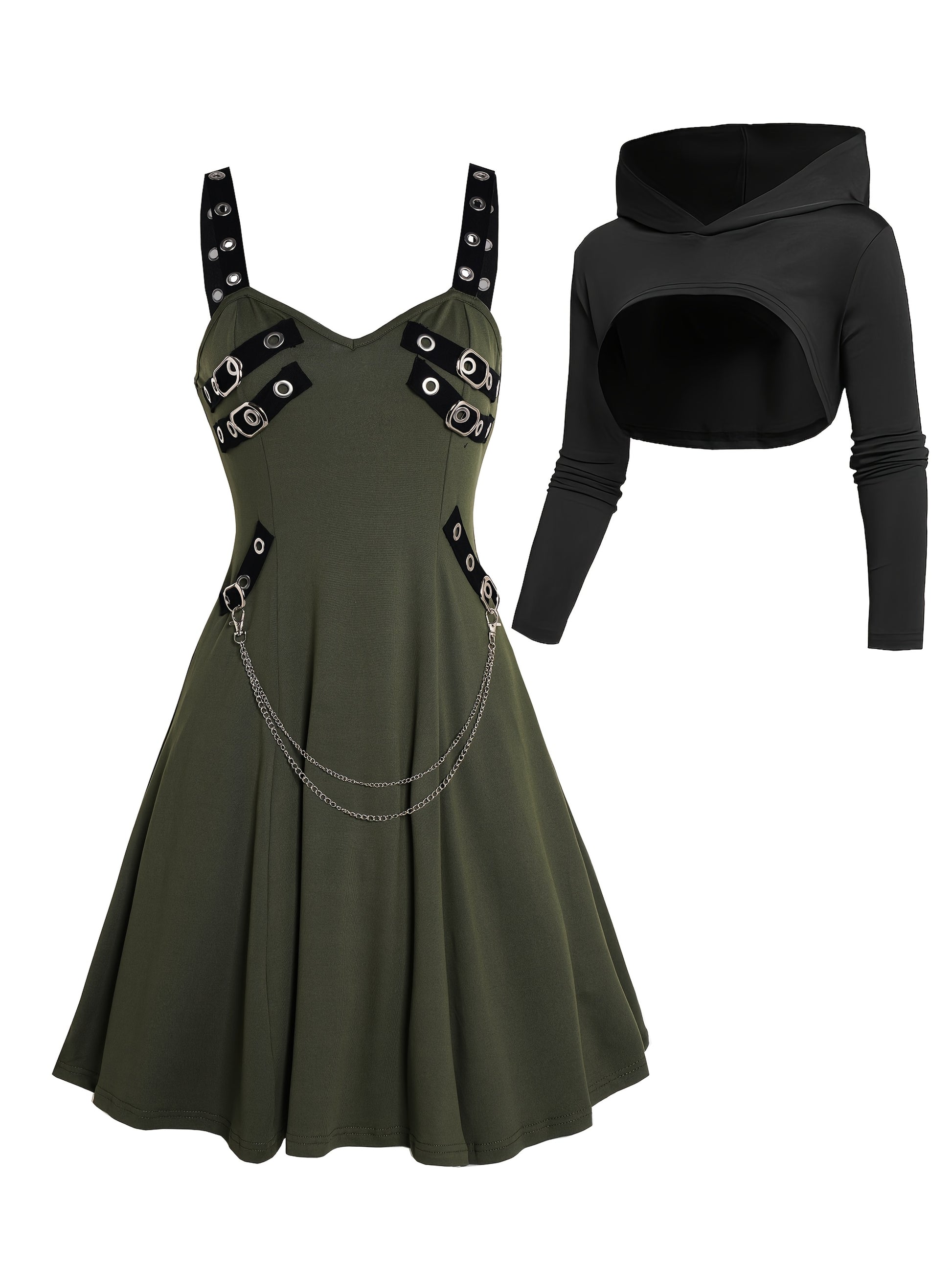 Unique Gothic Style Two-Piece Set: Rock Gothic Metal Piece Decorated V-Neck Vest Dress with Hooded Long Sleeve Top, Detachable Chain Vest Skirt and Curved Hem Caped Long Sleeve Shirt, Versatile Separates Women's Outfit for Pa