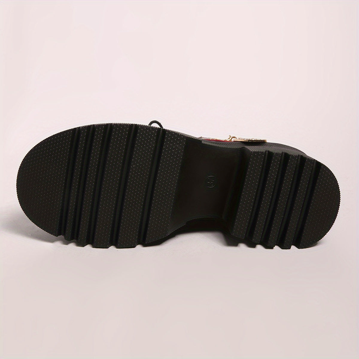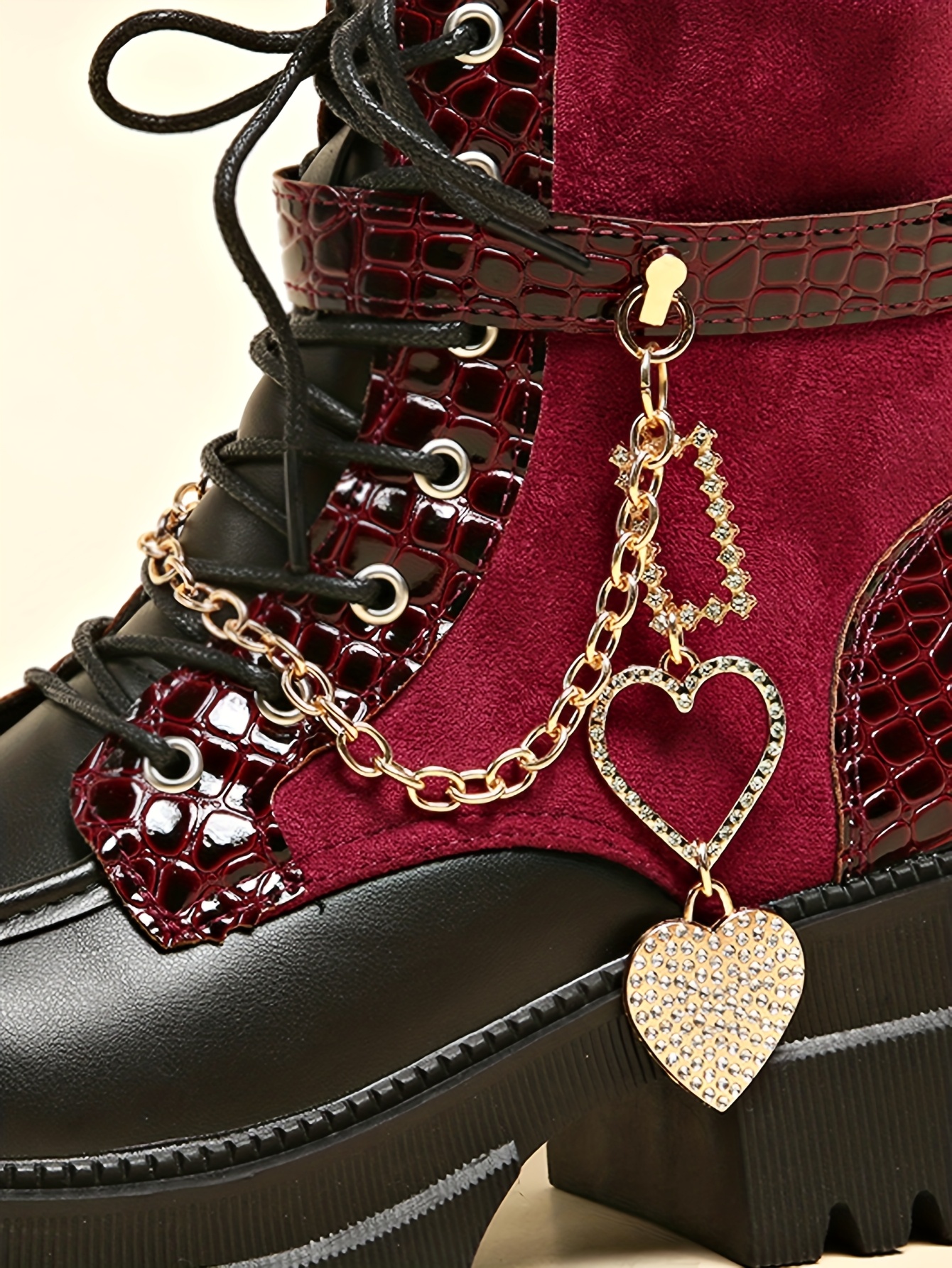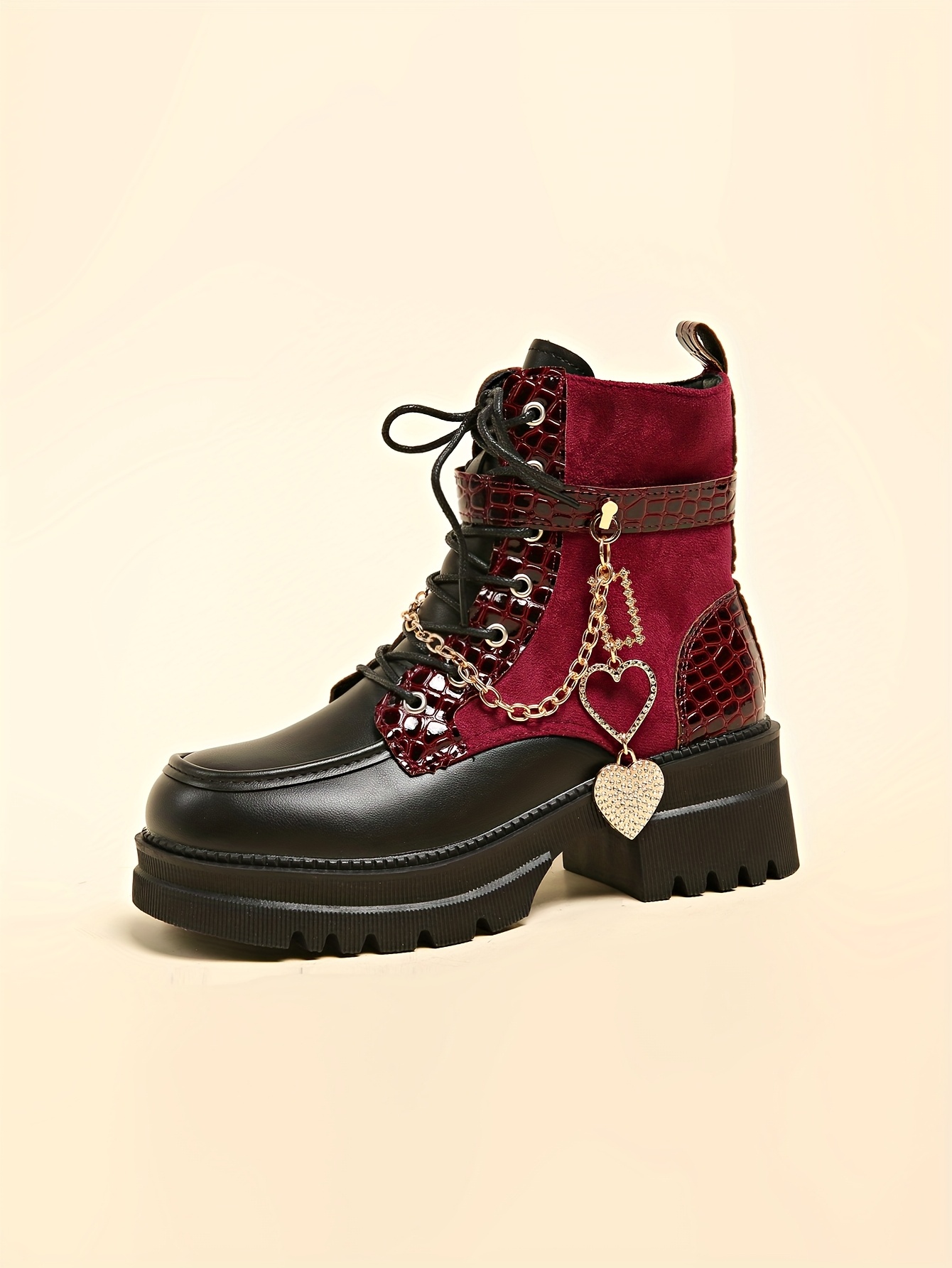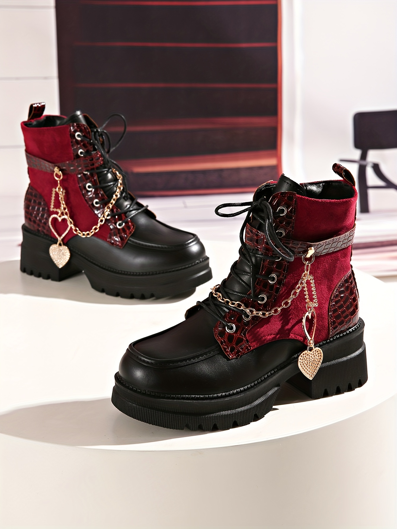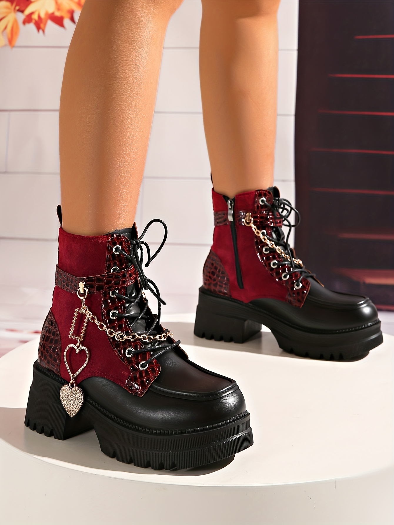 Women'S Chunky Platform Ankle Boots with Heart Metal Chain Accent - Red & Punk Style Zipper Closure, Thick Platform Heel, Synthetic Cover Upper & Rubber Sole