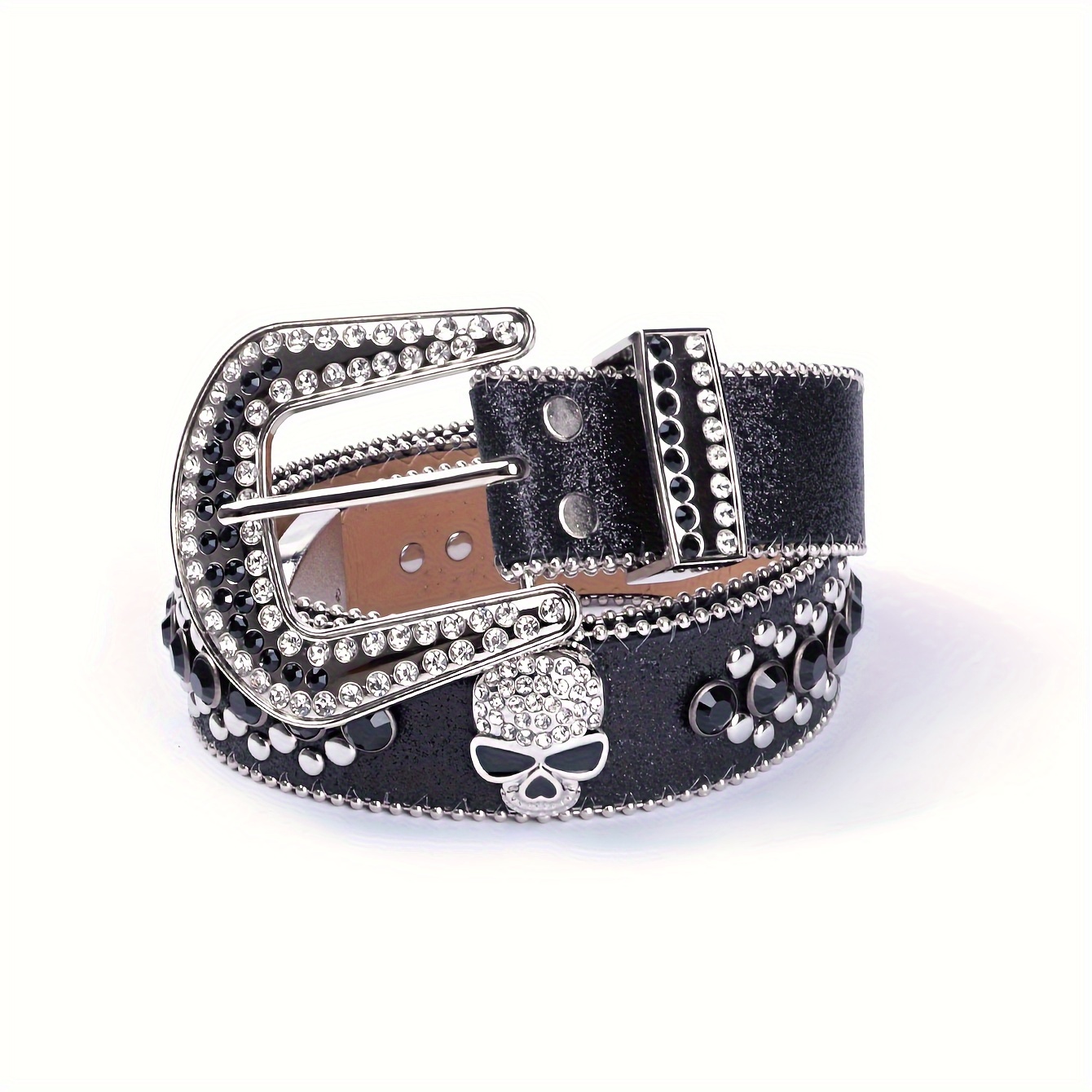 YIQIFEFA Punk Rhinestone & Stud Skull Belt for Women - Sparkling Black PU Western Cowboy Style Belt with Metallic Accents, Casual Outing to Party Accessory, Evening Accessory, Edgy Fashion Accessory, Stylish Craftsmanship, Al